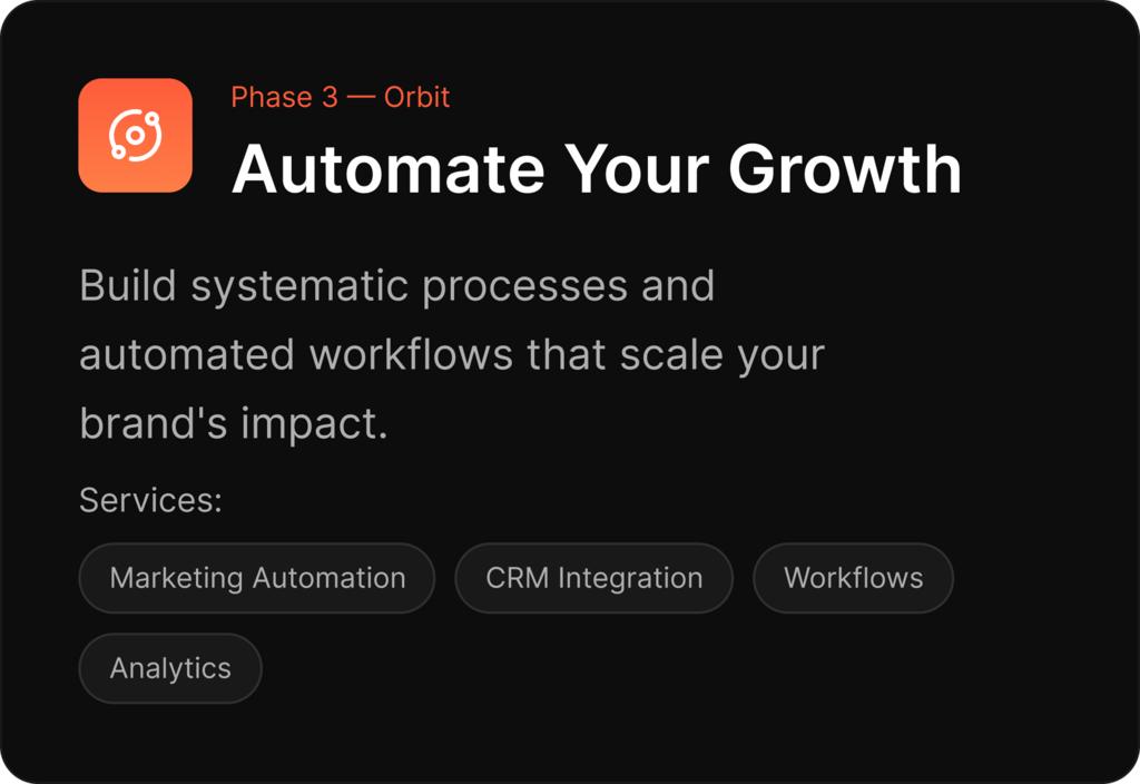 Every orbit amplifies the others. Strategy fuels design. Design powers automation. Automation sustains growth.